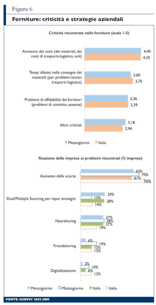 In riferimento all’export, i risultati dell’indagine segnalano come nel Mezzogiorno il 43% delle imprese manifatturiere esporta sui mercati esteri (53% in Italia), quote in calo rispetto al passato. Oltre al mercato nazionale, quello europeo e, a distanza, il mercato americano costituiscono le principali destinazioni delle imprese manifatturiere italiane, con il Mezzogiorno che registra una minore presenza su questi mercati rispetto alla media italiana. Le previsioni delle imprese a proposito dell’andamento dei mercati di sbocco di qui al 2027 mostrano diverse sfumature a livello territoriale: per le imprese del Mezzogiorno peggiorano le attese circa l’andamento del mercato domestico (il saldo tra attese positive e attese negative peggiora di 9 punti percentuali), per quello europeo (saldo in calo di 8 punti) e, soprattutto, le previsioni sull’andamento dei mercati extra europei, con il saldo che passa in territorio negativo (-3%) (figura 5). Passando ai rapporti internazionali di fornitura, si vede come il sistema manifatturiero italiano risulti pienamente integrato all’interno delle catene internazionali di fornitura: dall’indagine del 2025 emerge che il 31,7% delle imprese (38,6% in Italia) ha fornitori localizzati oltre i confini nazionali, una percentuale in sensibile calo rispetto allo scorso anno (-11,3 p.p., -4,4 p.p. a livello nazionale), ma in linea rispetto a quella rilevata nella prima edizione della survey (2021). Guardando alle aree di provenienza delle forniture, i risultati per il Mezzogiorno segnalano una minore incidenza dei paesi Ue rispetto alla media nazionale (il 28% contro il 34%) e un minor numero di imprese con fornitori dal continente americano (il 2% nel Mezzogiorno, contro il 5% medio in Italia). Viceversa, per le imprese che hanno fornitori esteri, aumenta l’incidenza delle forniture dall’estero sul totale: nel Mezzogiorno la quota di imprese con forniture dall’estero pari ad almeno il 40% del totale è passata dal 14% al 40% (in Italia dal 17% al 26%). Il quadro che ne risulta vede, dunque, una quota minore di imprese manifatturiere meridionali con fornitori esteri rispetto alle altre aree del Paese, ma una maggiore incidenza degli acquisti dall’estero per quelle imprese che hanno rapporti di fornitura internazionali. Va, comunque, detto che tali rapporti sono stati caratterizzati, negli ultimi anni, da rilevanti difficoltà e, tra le principali criticità segnalate alle imprese, l’aumento dei costi è quella ritenuta maggiormente impattante per l’attività d’impresa. Le imprese meridionali assegnano una valutazione di 4,4 su un massimo di 5 a proposito dell’impatto dell’aumento dei costi delle forniture (4,35 a livello nazionale). In risposta ai problemi riscontrati, le imprese (meridionali e nazionali) hanno preferito incrementare il livello delle scorte di magazzino (di componenti e prodotti finiti); tuttavia, confrontando i risultati con quelli della survey dello scorso anno si assiste a una crescita della percentuale di imprese che hanno scelto strategie di «Dual/Multiple sourcing per input strategici» e di «Nearshoring» (figura 6).