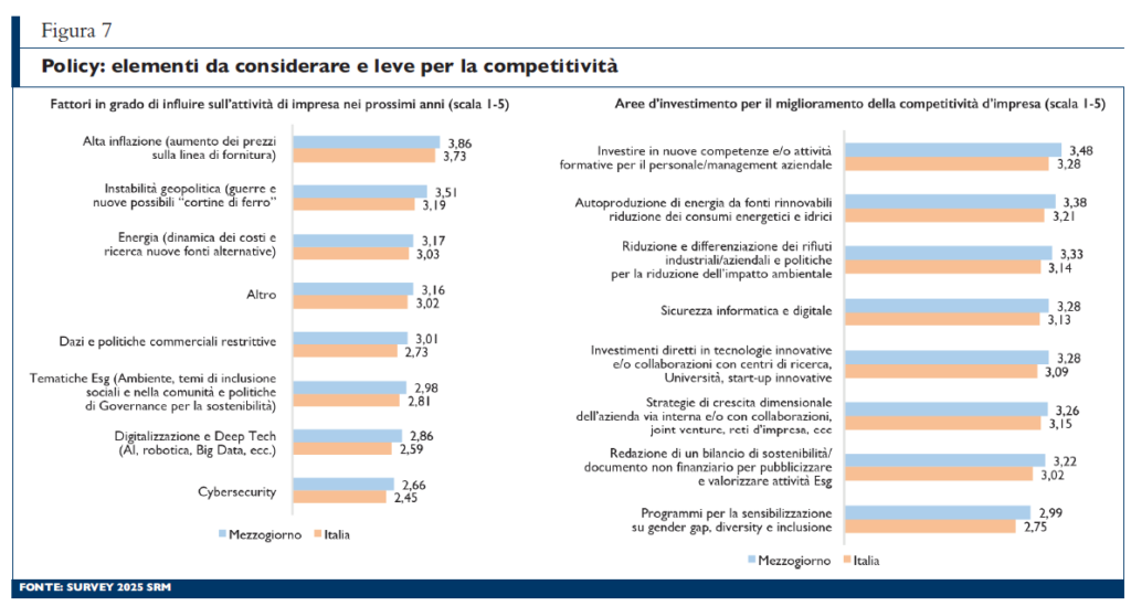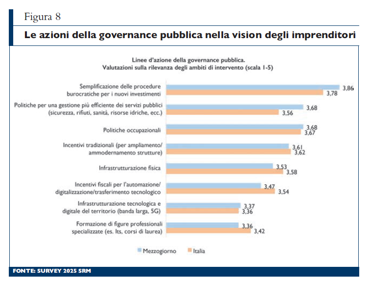 Ogni scelta effettuata dagli imprenditori, che sia legata agli investimenti o ad altre tematiche, è influenzata da molteplici fattori, tra cui, non secondario, il contesto di riferimento che, soprattutto in questi ultimi anni, ha visto il susseguirsi di molteplici eventi in grado di influire sull’attività aziendale e sull’assetto competitivo nel prossimo futuro. Dall’ultima survey condotta è emerso come i fattori giudicati come maggiormente impattanti sull’attività d’impresa riguardano la generale instabilità dei mercati, sia di sbocco (conflitti e instabilità geopolitica) che di approvvigionamento (alta inflazione, costo e disponibilità delle risorse energetiche), con valutazioni medie da parte delle imprese circa l’influenza di tali fattori sulla propria attività tra «me diamente» e «altamente» impattanti. La questione dei «dazi e politiche commerciali restrittive», pur essendo la survey stata svolta in un periodo in cui l’attenzione per il tema era molto alta, desta relativamente minori preoccupazioni da parte delle imprese: le opinioni circa l’impatto di tale tematica sull’attività aziendale la collocano solo al quinto posto tra i fattori elencati (sesto posto a livello nazionale). Posti tali ostacoli, le direzioni di investimento strategiche indicate dalle imprese vedono una sostanziale omogeneità delle risposte a livello territoriale. La «formazione del personale e la ricerca di nuove competenze» raccolgono le valutazioni medie più elevate in ordine di rilevanza, seguono interventi di sostenibilità ambientale («autoproduzione di energia da fonti rinnovabili e la riduzione dei consumi energetici e idrici» e «riduzione e differenziazione dei rifiuti industriali/aziendali e le politiche per la riduzione dell’impatto ambientale» (figura 7). Allo stesso tempo, le imprese hanno chiare aspettative su quale dovrebbe essere il ruolo della governance pubblica e, quindi, quali dovrebbero essere le azioni più opportune da introdurre. Interventi di «semplificazione delle procedure burocratiche per i nuovi investimenti» sono valutati al primo posto in ordine di rilevanza nel Mezzogiorno come nelle altre ripartizioni (punteggio medio 3,86 contro 3,78 per l’Italia). Valutazioni medie elevate vengono espresse dagli imprenditori meridionali anche a proposito di «politiche per una gestione più efficiente dei servizi pubblici (sicurezza, rifiuti, sanità, risorse idriche, altro)», una tematica che si colloca solo al quinto posto in ordine di rilevanza se si considera il dato nazionale. Al terzo posto, le «politiche occupazionali» e, solo in quarta posizione, gli «incentivi tradizionali» per l’ampliamento e/o ammodernamento delle strutture aziendali (figura 8).
